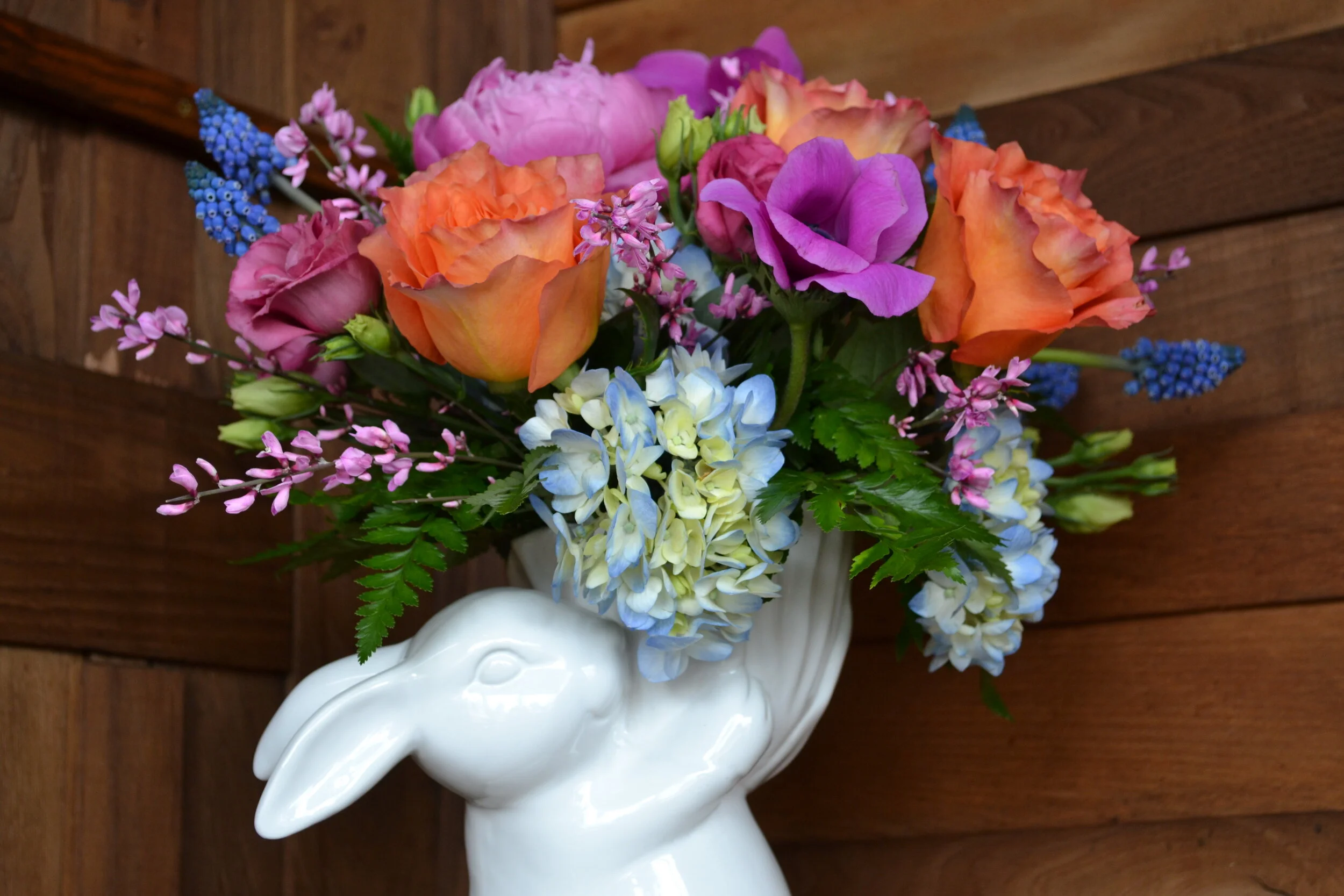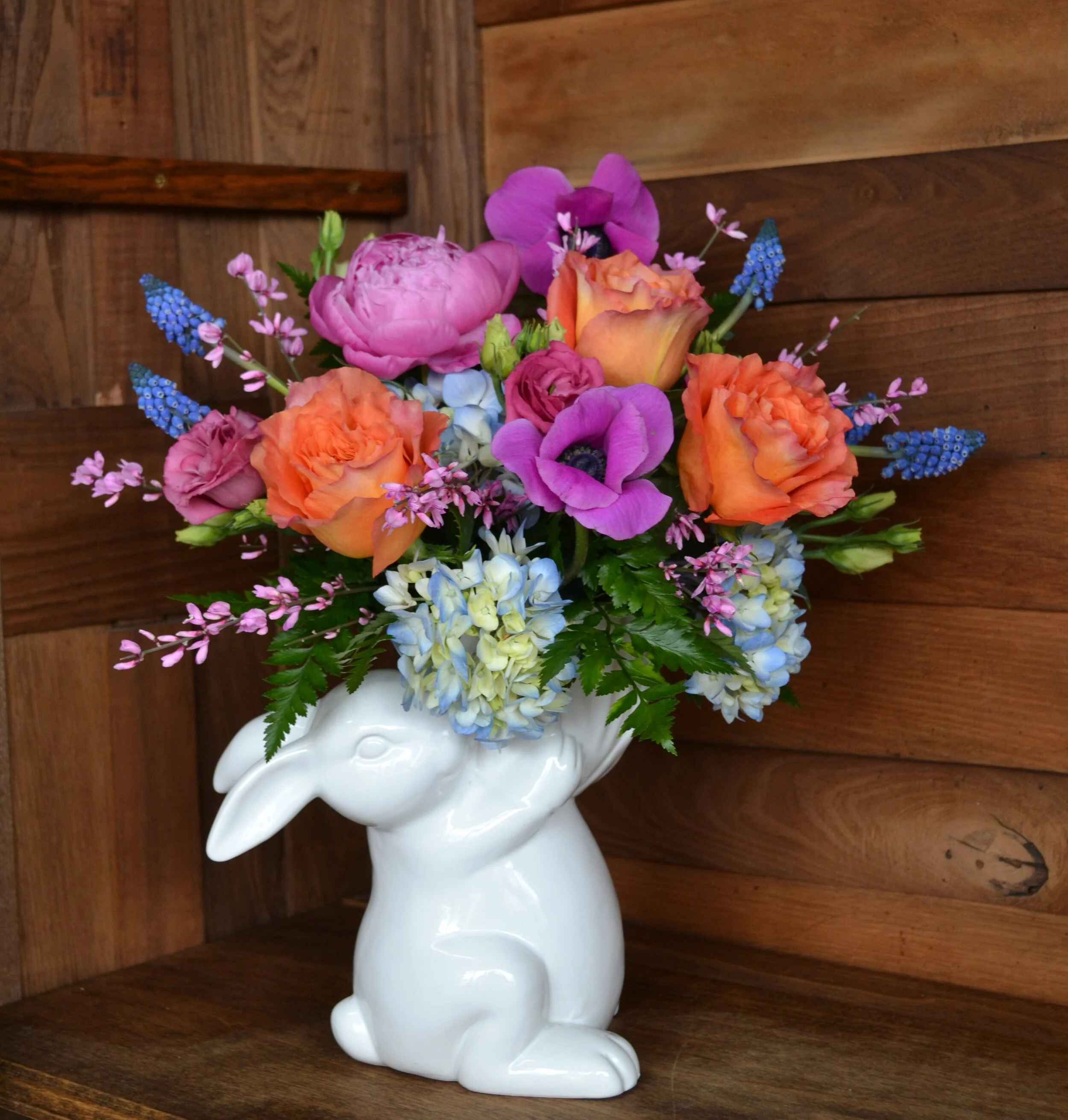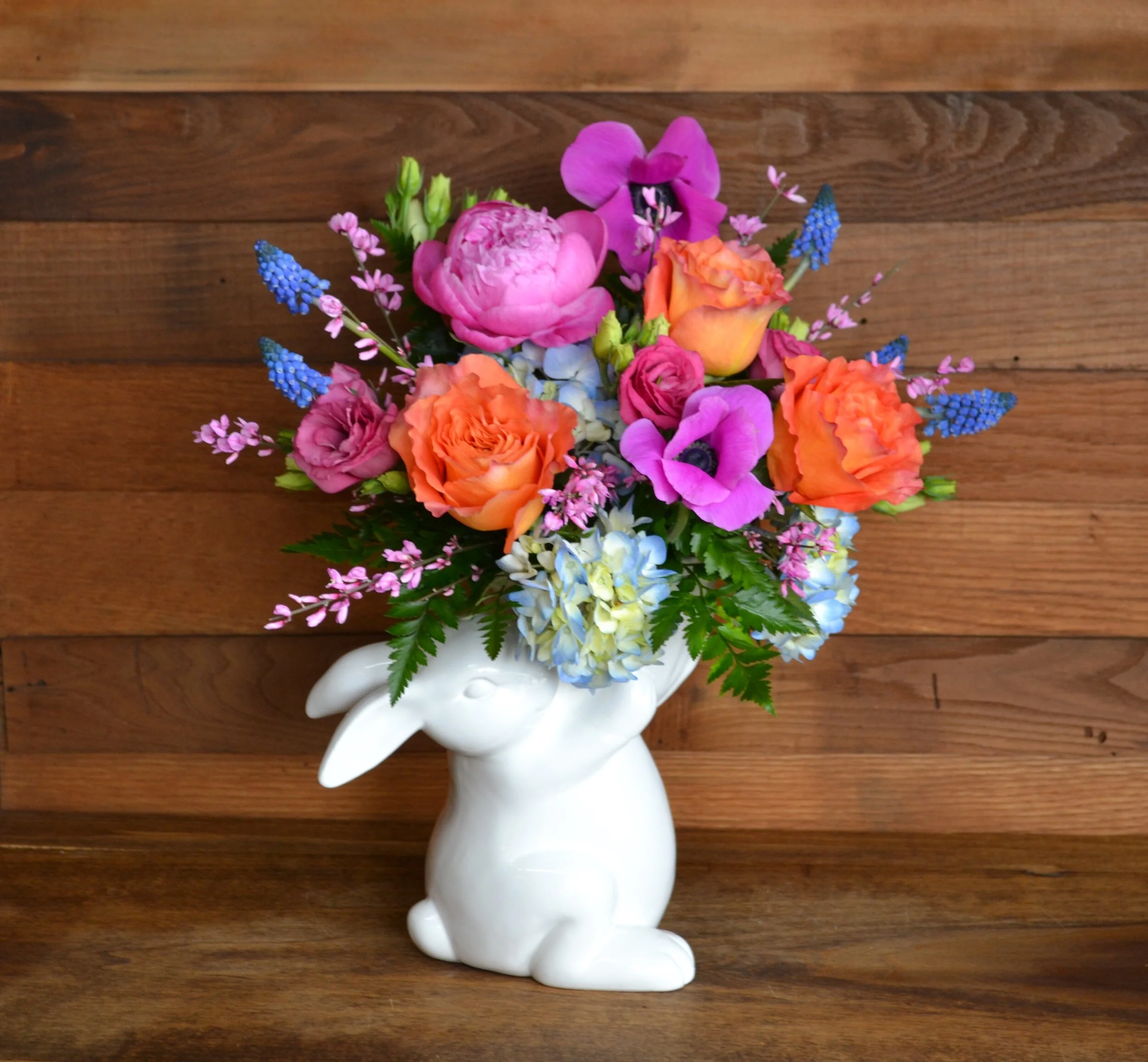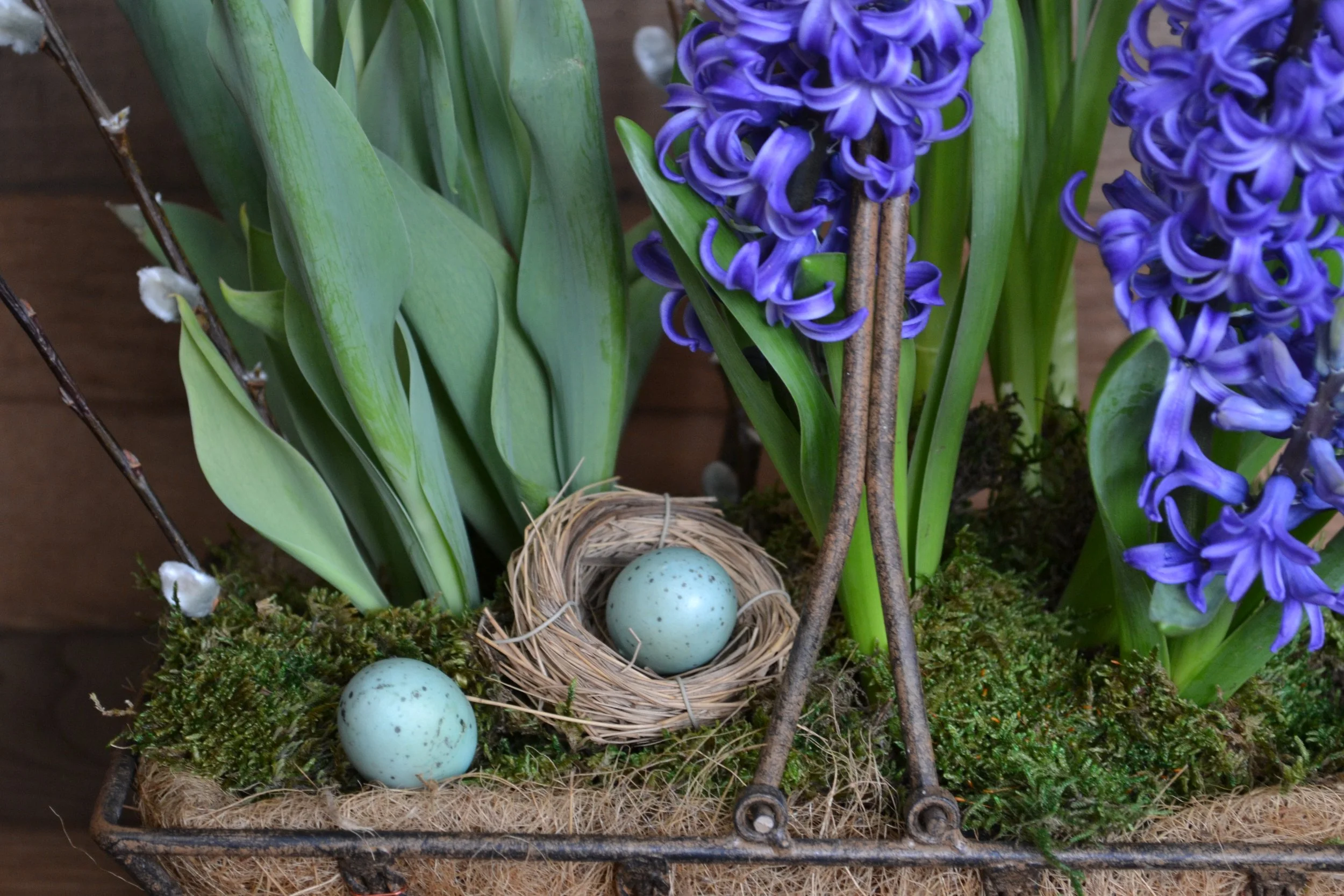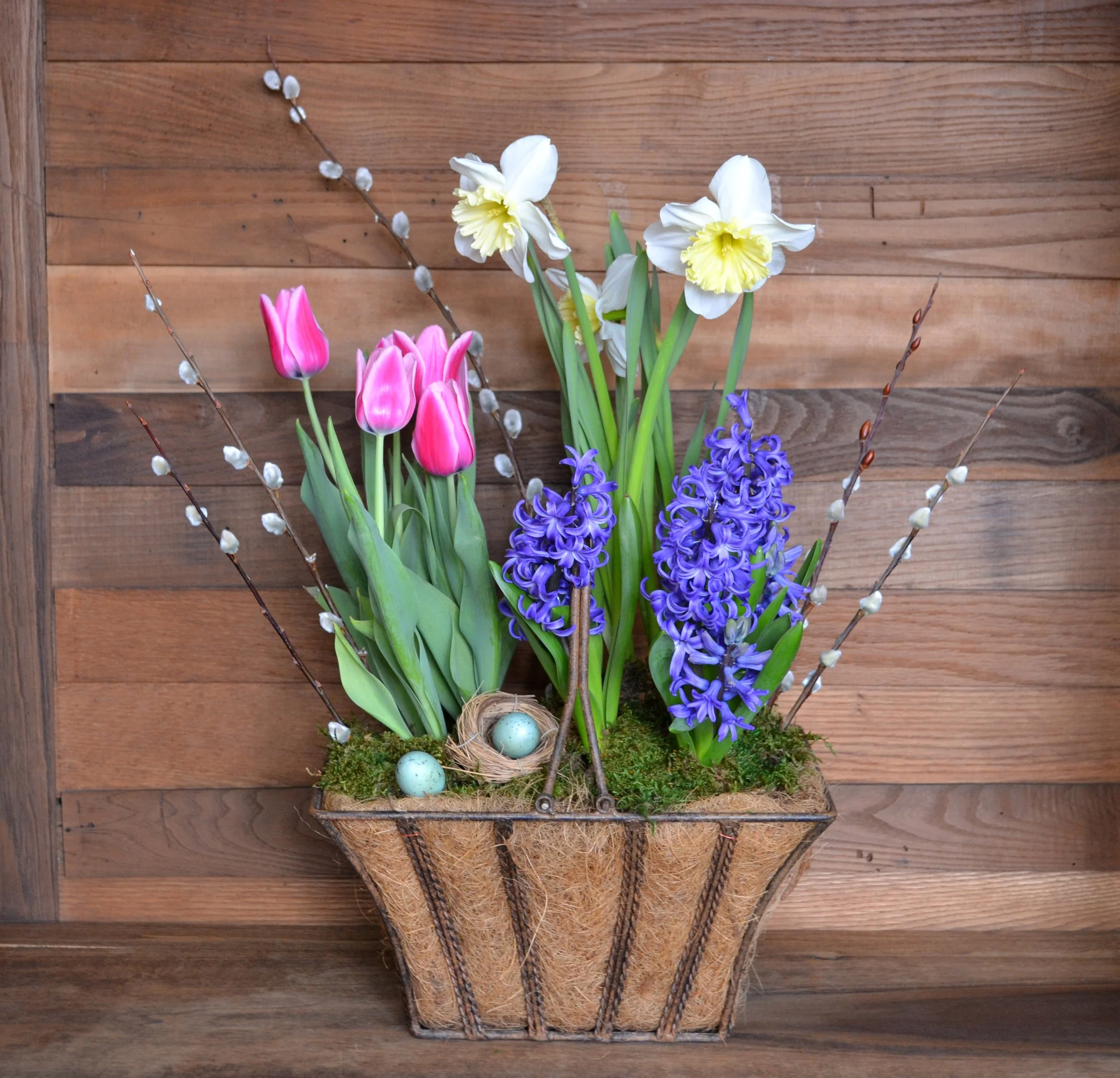 Colorful bulb garden blooming with color in a charming iron garden basket. All bulbs can be planted to enjoy year after year.